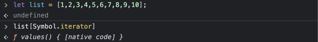 list 배열 속성인 Symbol.iterator 메소드를 실행하여 반환된 값을 iterator라는 변수에 할당해서 console.log로 확인해보자.