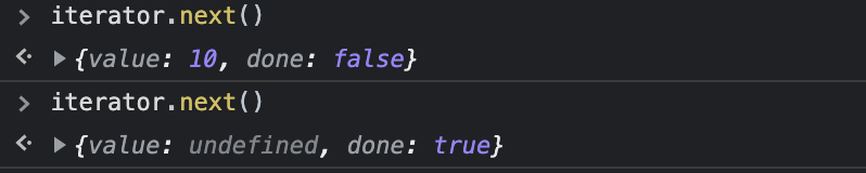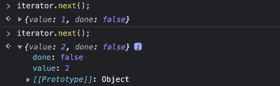 선언한 변수에 Iterator 객체가 할당되어있는 것과 next 메소드를 가지고 있는 것을 확인할 수 있다. next 함수를 실행하면 value와 done 값을 갖는 객체가 반환된다.